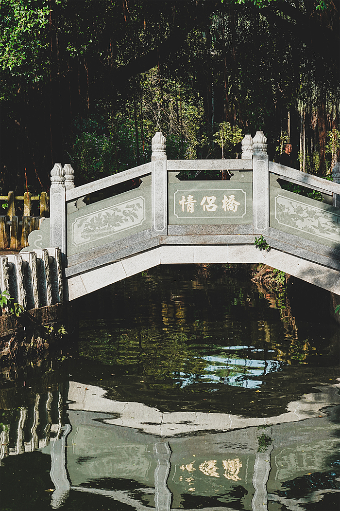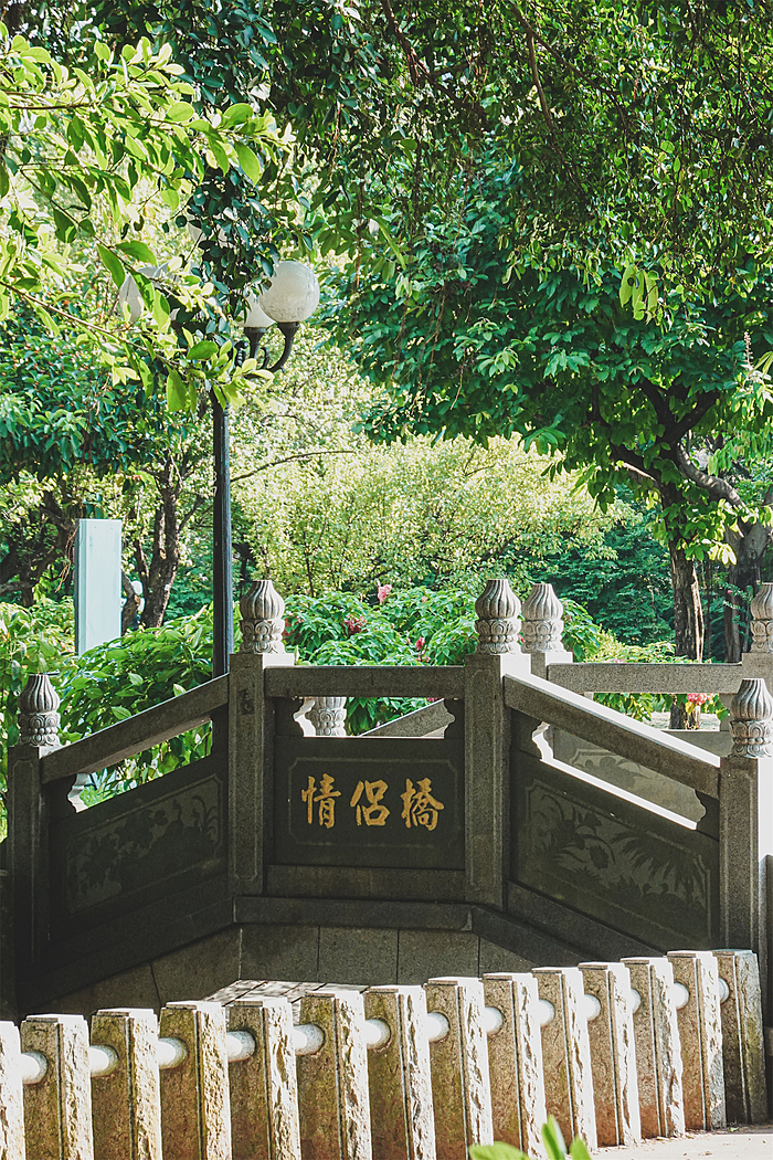 园内的一座网红石拱桥——情侣桥,静静横跨在碧波上。它小巧精致,桥面不宽,两人并肩而行刚好;四周,茂密的树木提供忠实的守护,枝叶相互交织形成浓荫,将这座小桥包裹。阳光透过叶缝,洒下斑驳的光影,为整个清幽的空间披上一层梦幻金纱。