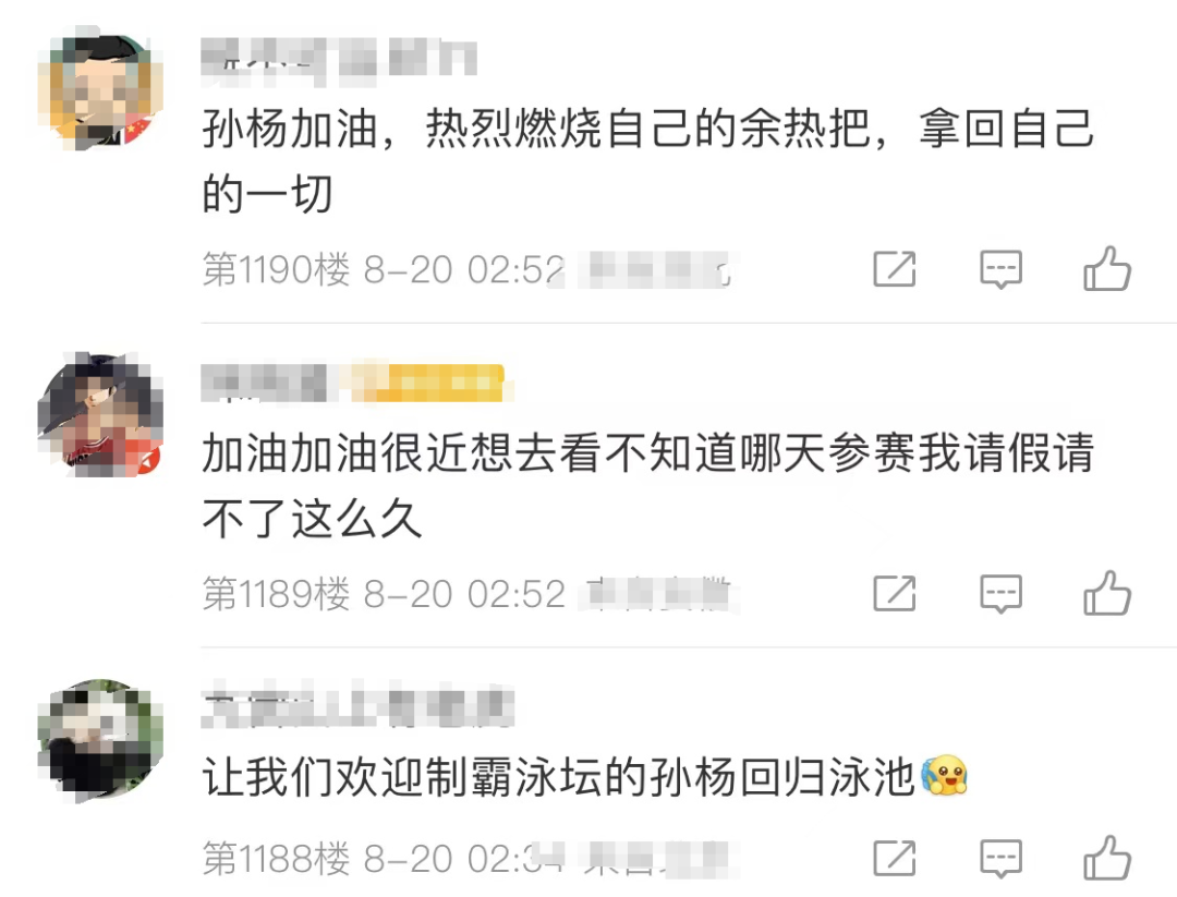 孙杨重返赛场的消息一出,很快引起热议,不少网友纷纷为他送上祝福,“不是每个人都有这样的勇气,孙杨没有辜负他热爱的游泳”“真没想到还能再次见到赛场上的孙杨”“王者归来!孙杨加油”。