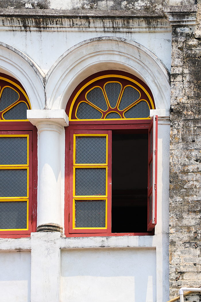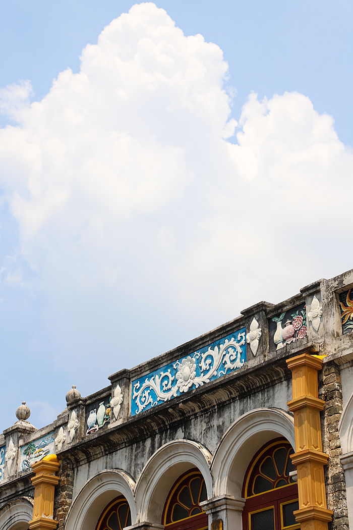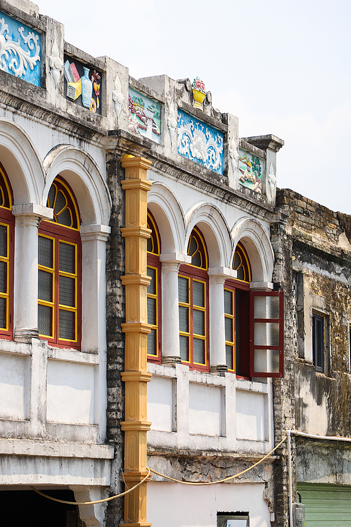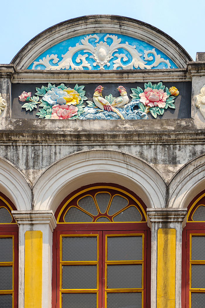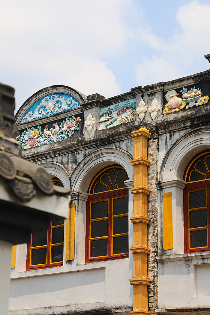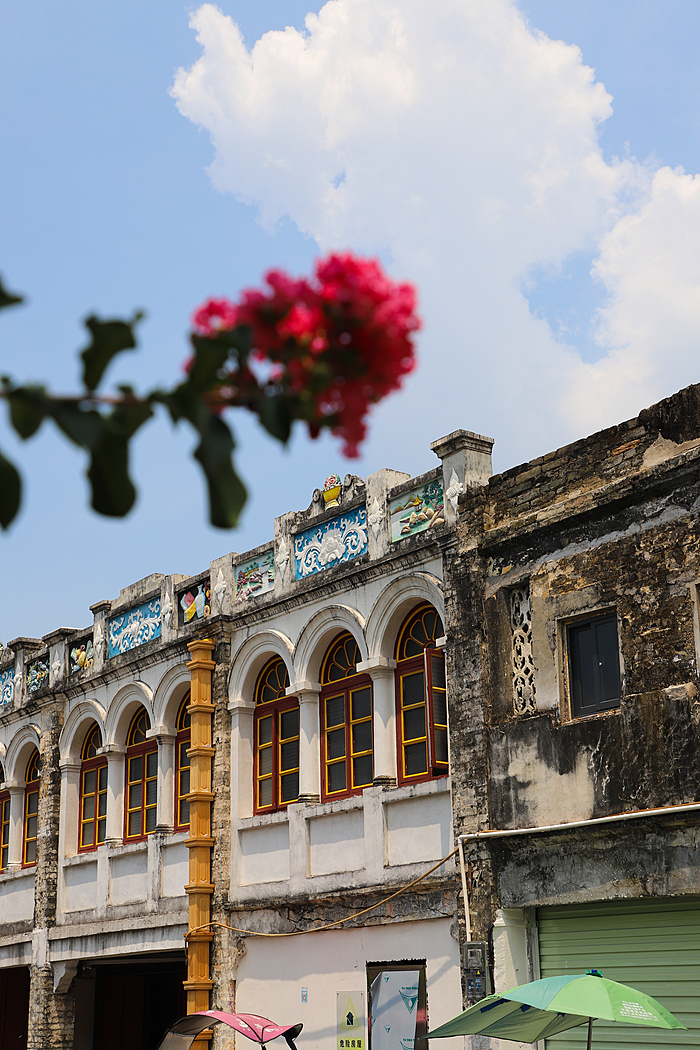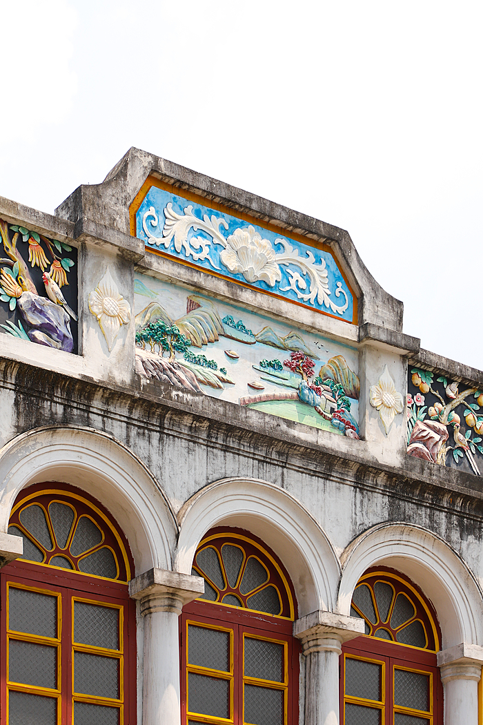 骑楼大多为两层阁楼瓦房,建筑保留了岭南传统民居的“三雕”艺术——砖雕、木雕、石雕。檐下的雕刻精巧细腻,图案色彩鲜艳夺目;二层的描金窗户与精致的阁楼则透出浓郁的南洋复古气息,精致而雅致。