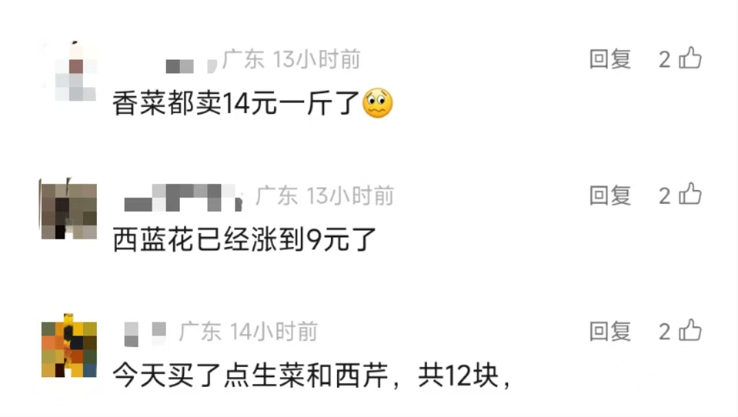 商超方面,近期蔬菜价格、销量同样有变化。据大润发超市华南区市场总监盛艳介绍,门店八成蔬菜品类价格上涨,上涨较为明显品类包括瓜果类、结球类、调味类,如西蓝花、青瓜、莴笋、菜心等价格涨幅最为明显。