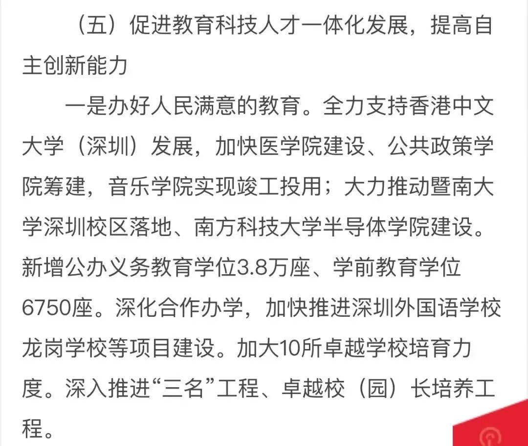 在龙岗区2024年工作报告中,明确提到全力支持香港中文大学(深圳)发展,加快医学院建设、公共政策学院筹建,音乐学院实现竣工投用;大力推动暨南大学深圳校区落地、南方科技大学半导体学院建设。