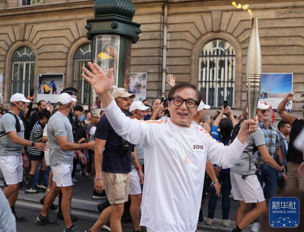 ↑成龙(左)在巴黎残奥会圣火传递中。