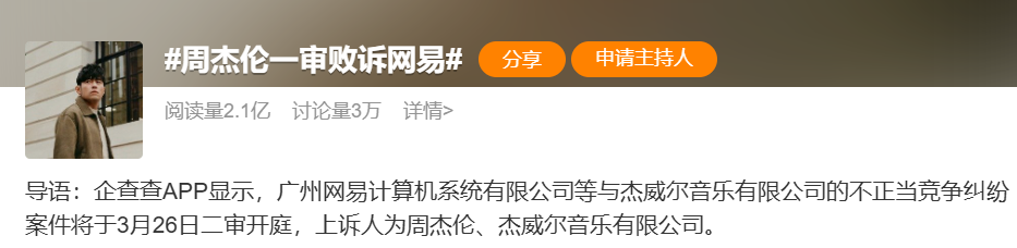话题#周杰伦败诉网易#