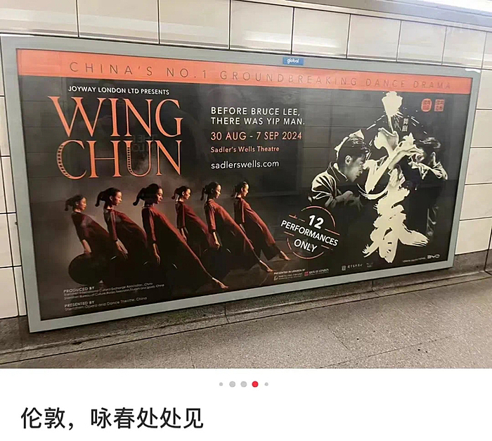据了解,目前在伦敦街头、地铁等地,已经可以看到《咏春》高悬的演出预告海报,英国伦敦购物胜地和韦斯特菲尔德购物中心更持续在广场大屏轮播海报,为演出预热。