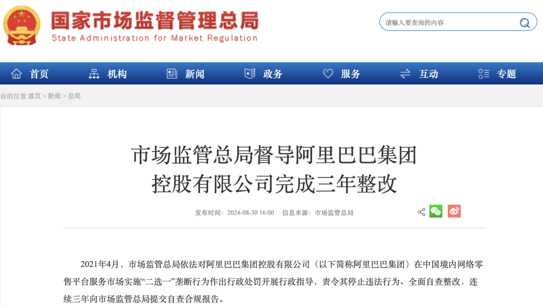 8月30日下午,国家市场监督管理总局发布公告,宣布阿里巴巴集团完成三年整改,取得良好成效。