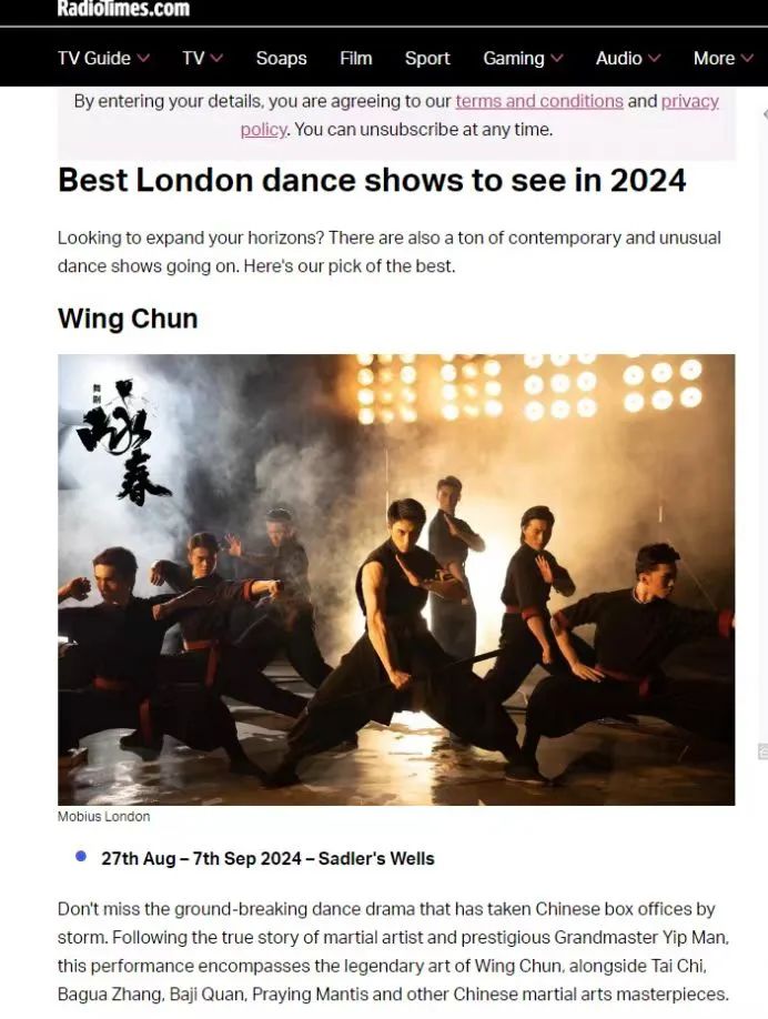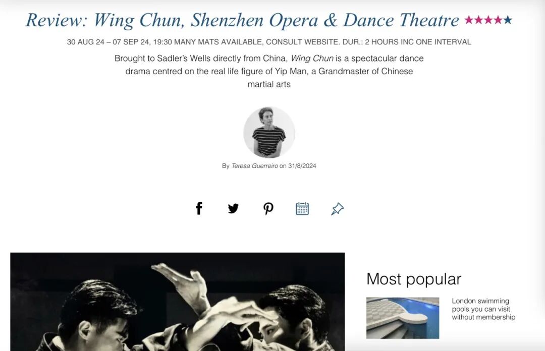 其实,在首演之前,一些英国媒体如Radiotimes.com已将《咏春》列为 “2024年最值得观看的伦敦舞蹈表演”予以推荐,称“千万不要错过这部席卷中国票房的开创性舞剧。该剧改编自著名武术宗师叶问的真实故事,涵盖了传奇的咏春拳、太极拳、八卦掌、螳螂拳和其他中国武术杰作”。