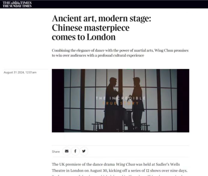 伦敦首场演出的第二天,《泰晤士报》即以“古代艺术、现代舞台:中国杰作亮相伦敦”为题,报道了《咏春》首映情况,称该剧“将舞蹈的优雅与武术的力量相结合,必将以深刻的文化体验赢得观众的青睐”。