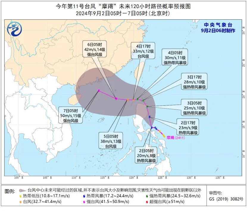 中国天气网首席气象分析师信欣介绍,目前集合预报后期的路径发散度还有点大,但“摩羯”大概率会登陆我国,尤其是广东西部-海南一带的可能性相对大。