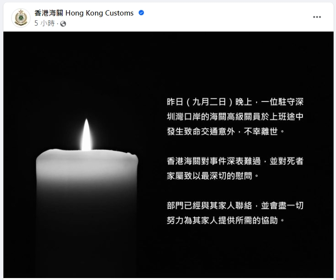 香港海关FB网页凌晨后贴上悼念帖文,指部门已与家人联络,并会尽一切努力为其家人提供所需的协助。