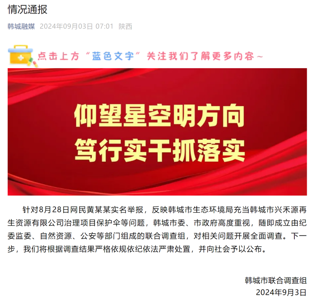 记者3日从陕西省韩城市联合调查组获悉,针对8月28日网民黄某某实名举报,反映韩城市生态环境局充当韩城市兴禾源再生资源有限公司治理项目保护伞等问题,韩城市委、市政府高度重视,随即成立由纪委监委、自然资源、公安等部门组成的联合调查组,对相关问题开展全面调查。调查处置结果将及时向社会予以公布。