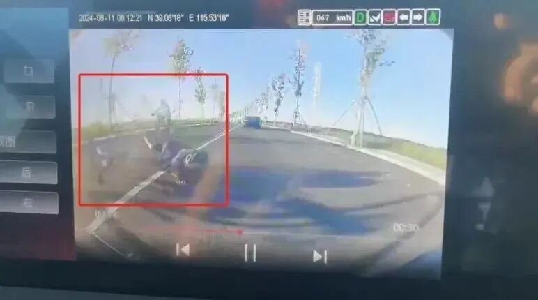 视频显示,孩子摔倒后遭行驶中的汽车碾压,头耳部出血。其父亲大喊:“坚持住,别吓我啊。”涉事汽车的行车记录仪显示,汽车车速52km/h左右,事发时汽车两侧均有骑行者。
