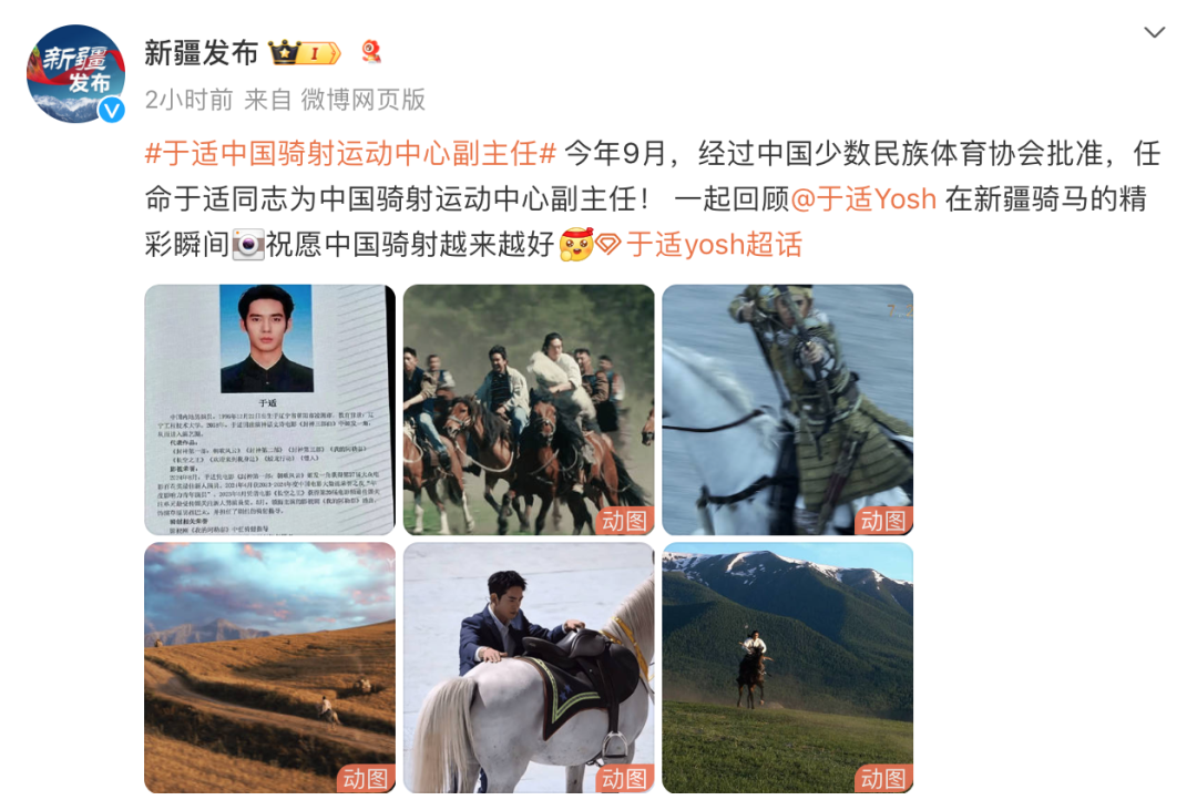 9月8日,由中国少数民族体育协会主办的2024全国骑射U系列赛(深圳尚武站)现场传来一则新消息——今年9月, 经过中国少数民族体育协会批准,演员于适被任命为中国少数民族体育协会马文化运动委员会骑射运动中心副主任。