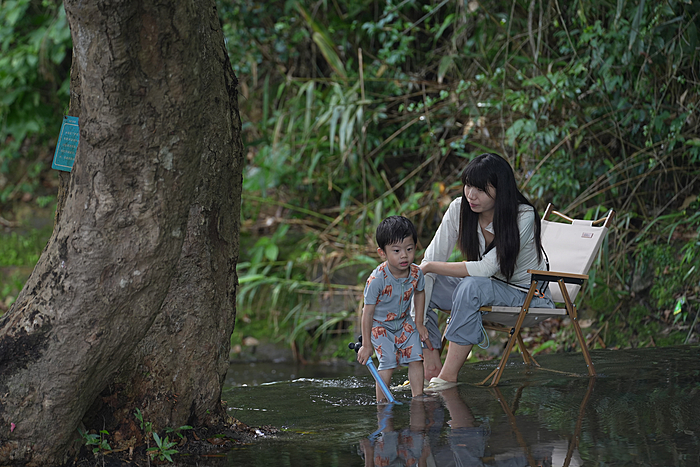 ▲市民带着孩子在金龟河戏水。 深圳晚报记者 严文婷 摄