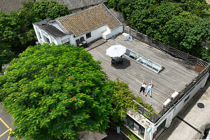 外间的天台宽敞开阔,铺设着木地板。工作人员介绍,这里是书房的室外活动区,在天气良好的情况下,一些沙龙活动也会在此举办。正值多云天气,深晚记者看到,几位来此游览的市民在天台的木地板上席地而坐,仰望天空的云卷云舒,脸上笑意油然而生。
