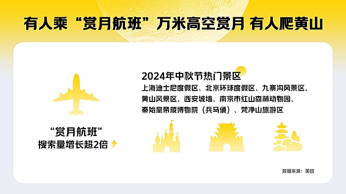 “凭高眺远,见长空万里,云无留迹。”美团数据显示,截至9月5日,“赏月航班”搜索量环比增长超2倍,上海、广州为中秋“赏月航班”热门搜索地。