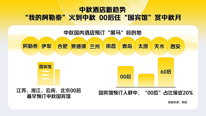 住“国风酒店”,赏中秋月色。美团数据显示,“国风酒店”搜索量上涨219%。在美团预订“国宾馆”的用户中,00后占比接近20%,60后也是“国宾馆”高频预订人群。江苏、浙江、云南、北京的00后年轻人,最早预订中秋国宾馆。南京00后游客黄晔,中秋节带着家里长辈去四川旅游,预订了金牛宾馆。“老牌国宾馆历史文化氛围浓厚,加上地理位置优越,树木成荫,特别适合赏月过中秋节。”