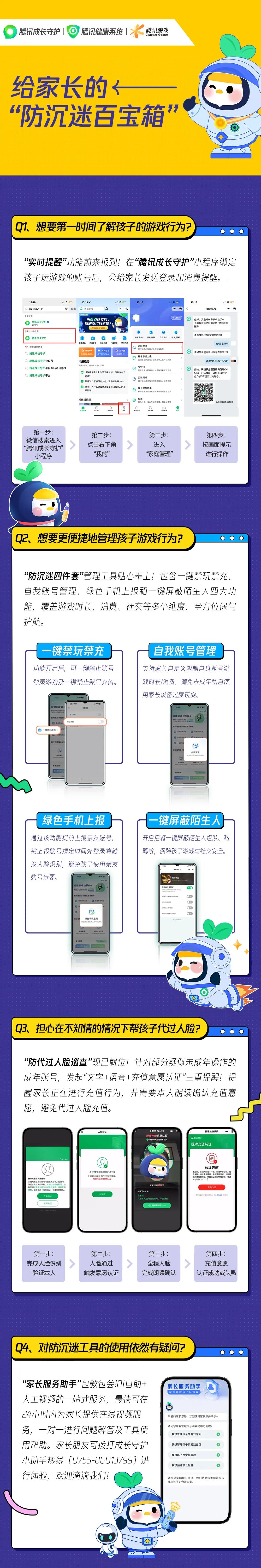 对此,腾讯游戏给出的新思路是:一方面利用人脸识别等前沿技术,甄别疑似未成年人的账号,并持续迭代算法、策略以加强管控能力;另一方面则是为家长提供更多工具,让家长更多地参与到未成年防沉迷工作中。
