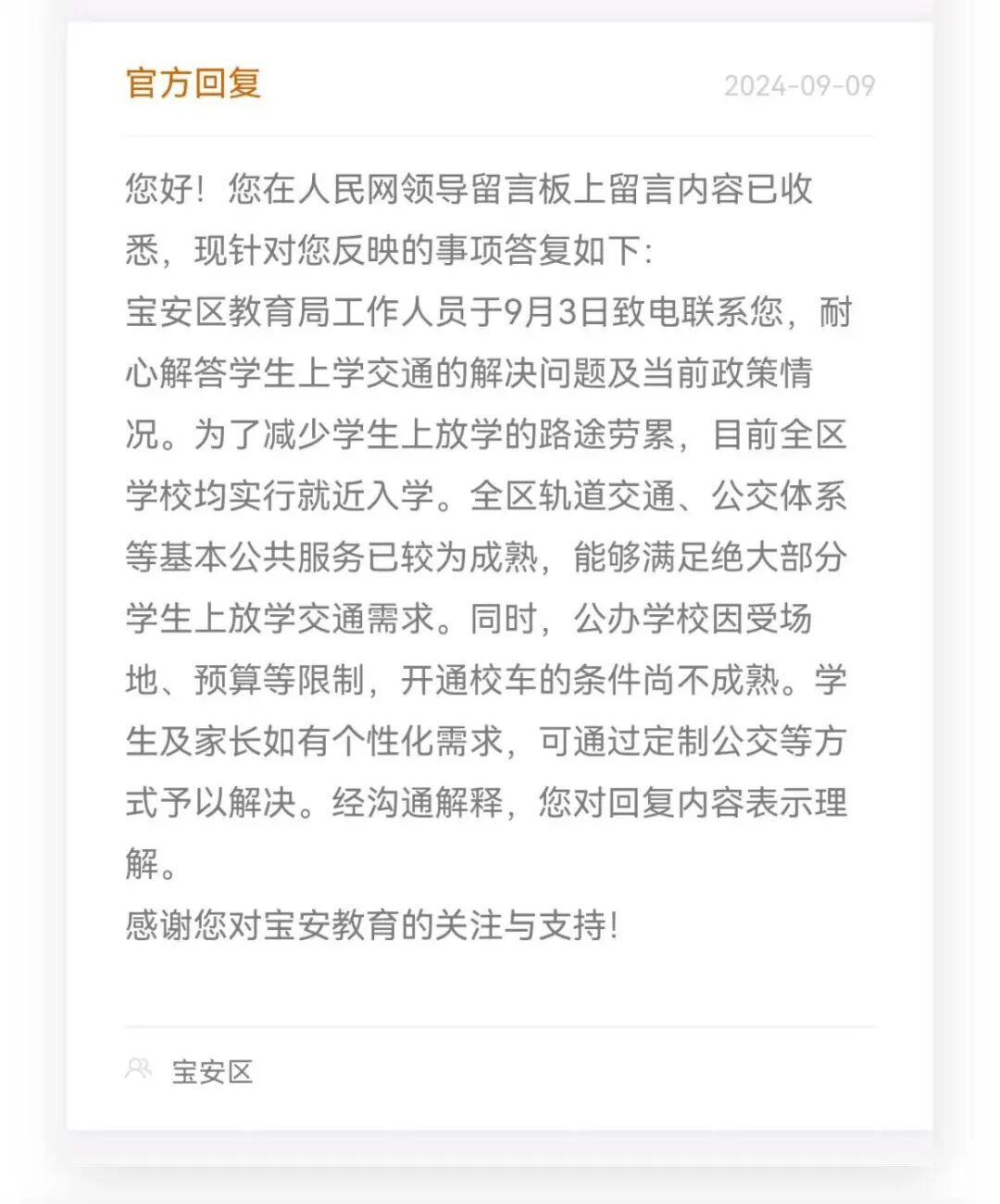 宝安区教育局回复称,公办学校因场地、预算等限制,开通校车的条件尚不成熟。学生及家长如有个性化需求,可通过定制公交等方式予以解决。
