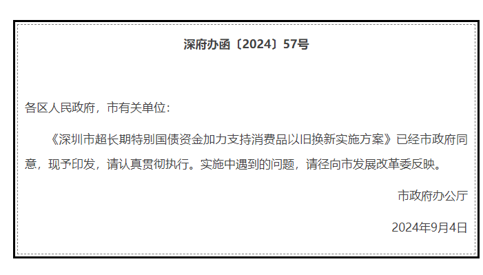 9月5日,《深圳市超长期特别国债资金加力支持消费品以旧换新实施方案》印发,明确支持个人消费者乘用车置换更新、汽车报废更新、家电产品以旧换新等。隔日,深圳就召开新闻发布会专题介绍相关情况,并启动家电产品“以旧换新”线下活动。