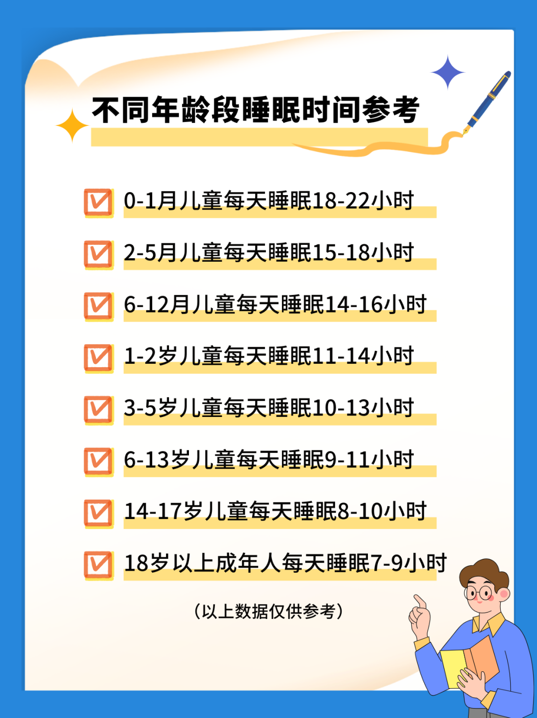 不同年龄段儿童,睡眠时长也会略有不同,睡眠时间过长或者过短都是不利于身心健康的,具体时长可参考下表↓