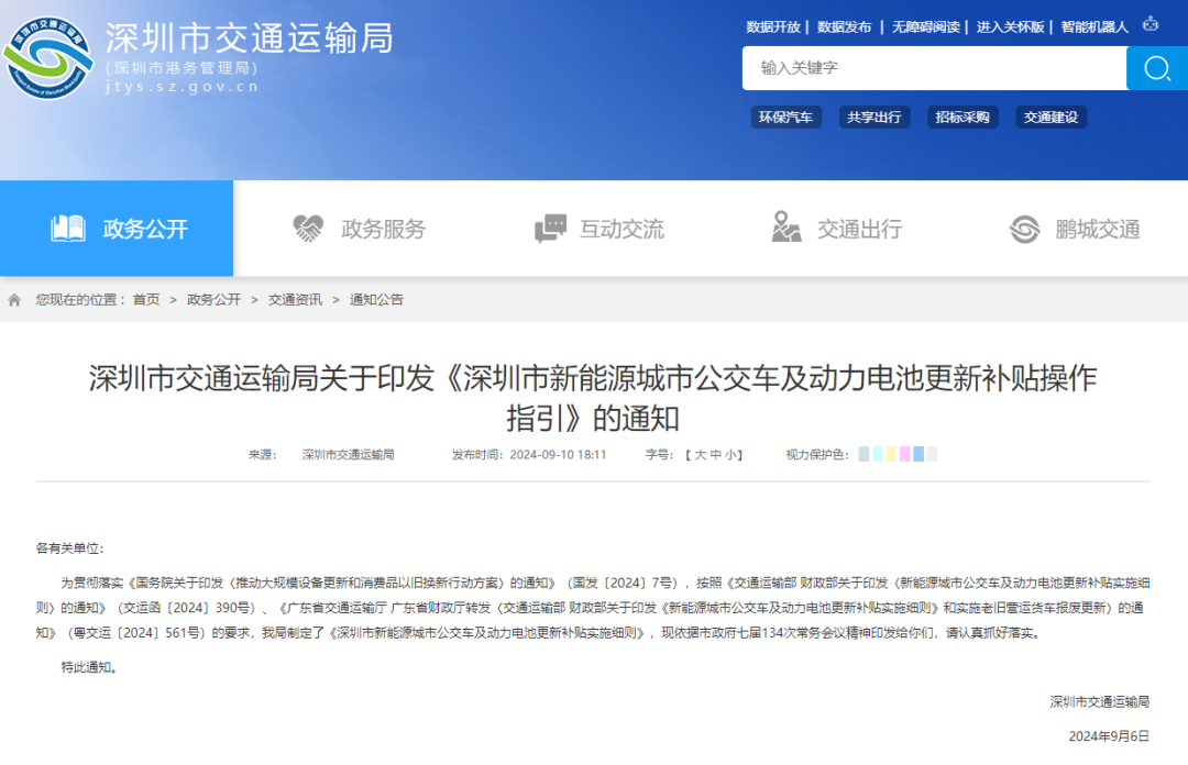 新能源交通是城市发展的重要硬件支撑。为进一步落实国家关于推动新能源交通发展以及大规模设备以旧换新的相关精神,近日,深圳市交通运输局印发了《新能源城市公交车及动力电池更新补贴操作指引》。
