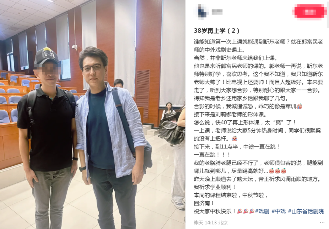 近日,多位网友晒出照片,称在中戏上课时偶遇“同窗”靳东,透露他已经考上中戏博士。靳东的粉丝闻讯与有荣焉,“当着团长、演着话剧电视剧、读着博士、出席各种活动,我哥已经next level了!”