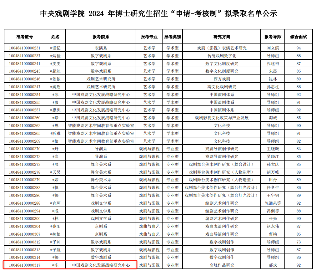 据中央戏剧学院官网,中央戏剧学院2024年博士研究生招生拟录取名单中,“普通招考”序列的名单里没有与靳东名字相近的考生,但在“申请-考核制”序列的名单里,有一位考生名为“*东”,报考院系为中国戏剧文化发展战略研究中心,报考专业为戏剧与影视,研究方向为高峰作品研究,报考导师是中央戏剧学院院长郝戎。