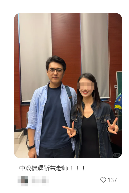 从网友们分享的图片和文字来看,大家是在中戏的戏剧史课堂上偶遇靳东的。面对各位“同窗”的求合影,靳东也非常耐心地一一满足。一位山东网友表示,靳东得知二人是老乡后,还主动和他说了几句家乡话。