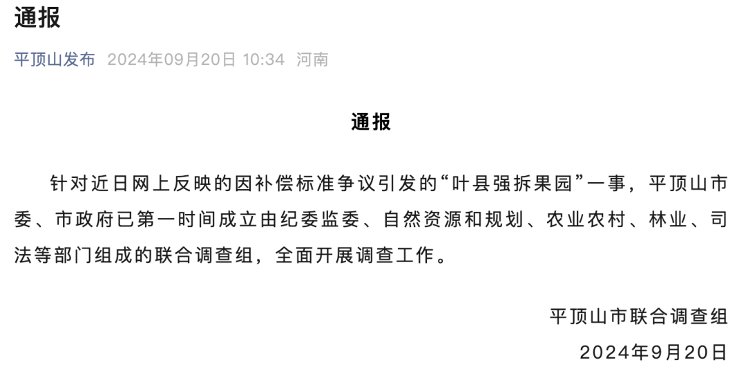 9月20日,平顶山市联合调查组发布一则通报,称针对近日网上反映的因补偿标准争议引发的“叶县强拆果园”一事,平顶山市委、市政府已第一时间成立由纪委监委、自然资源和规划、农业农村、林业、司法等部门组成的联合调查组,全面开展调查工作。
