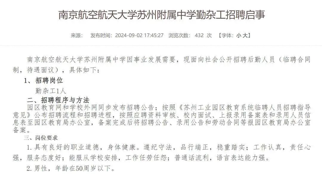 紫牛新闻记者在该学校官网上查询看到,学校于9月2日发布《南京航空航天大学苏州附属中学勤杂工招聘启事》称,学校因事业发展需要,现面向社会公开招聘后勤人员(临聘合同制,待遇面议),招聘岗位为勤杂工1人。岗位要求:1.具有良好的职业道德,身体健康。遵纪守法,品行端正,稳重踏实;工作认真,责任心强,服务态度好;能服从学校安排,工作任劳任怨;普通话流利,语言表达能力强。2.男性,年龄在50周岁以下。