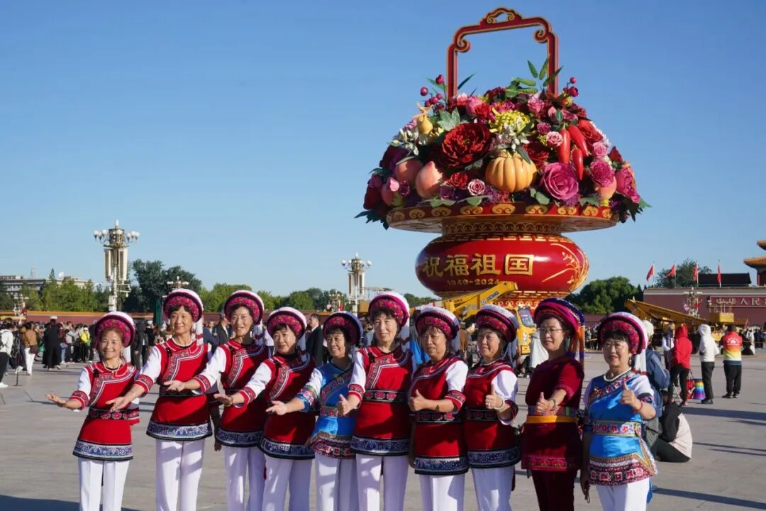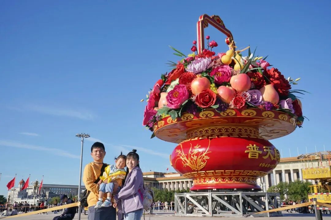 9月22日,“祝福祖国”巨型花篮吊装完成,亮相天安门广场。