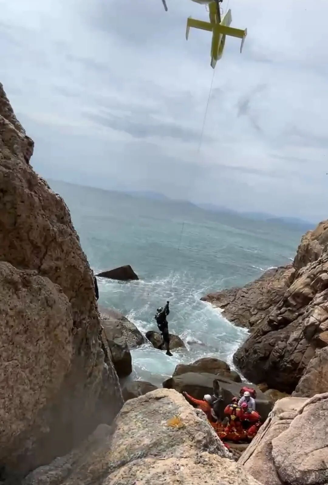 现场情况十分紧急,从海上与陆上均无法实施救援。市急救中心与大鹏新区应急管理局当机立断,启动航空医疗救护,使用直升机以绞车吊运方式进行紧急救援。