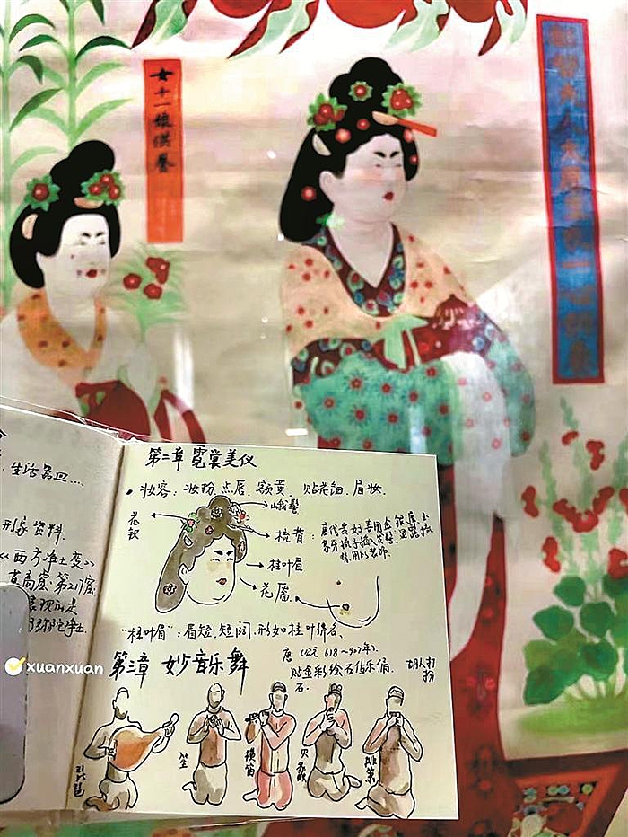 ▲艺术设计师小房(上)在深博画青铜器及其绘制的传统服饰作品(下)。