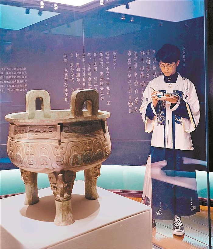 面对有“距离感”的文物,孩子大多在博物馆里待不住。乐然说,自己最初也待不住,但后来画多了,他发现文物的形式和图案都很美,而且还有特别的含义,用绘画的形式表现出来,感觉很有意思。“我的感受就是中华优秀传统文化非常有魅力。”在博物馆画速写,乐然最享受的就是画完后,拍上一张对影打卡照,那个时候可自豪了:“我又画完一件文物了!”