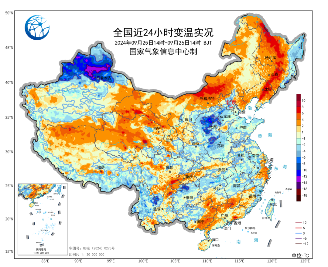 9月26日,强冷空气已经启程。下午,冷空气前锋已抵达我国新疆北部,并给当地带来了6-12℃降温,其中阿拉山口降幅达13.3℃,为14时降温最强的国家站。另外,华北中南部因为云量增多,一些地方出现阴雨天气,因此也有降温,尤其山西降温明显,局地降幅超过10℃。