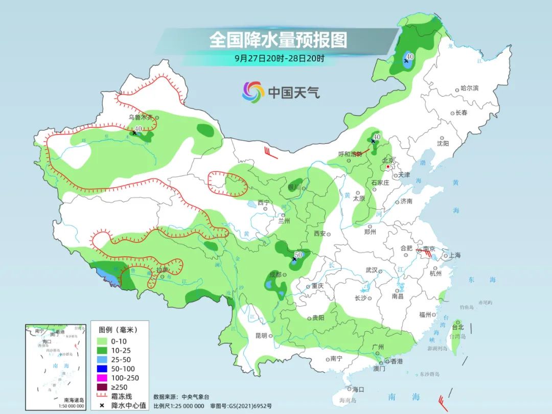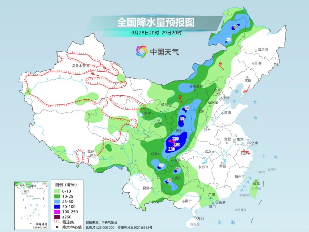 9月28日开始,降水将整体向东转移,内蒙古中西部和东北部、黑龙江西北部、西北地区东部、四川中东部、贵州中西部、广西西北部以及西藏南部等地部分地区将有中到大雨,其中,内蒙古河套地区和中部、陕西北部、四川盆地西北部以及西藏西南部和东南部等地部分地区有暴雨或大暴雨。