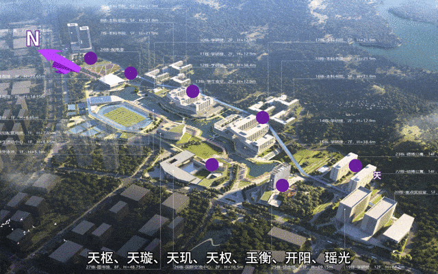 学校各个聚落天然地形成了北斗七星形状。因此,校园内从南到北分布的7个学研生活聚落,以其独特的方位排列,被赋予了北斗七星的名字。