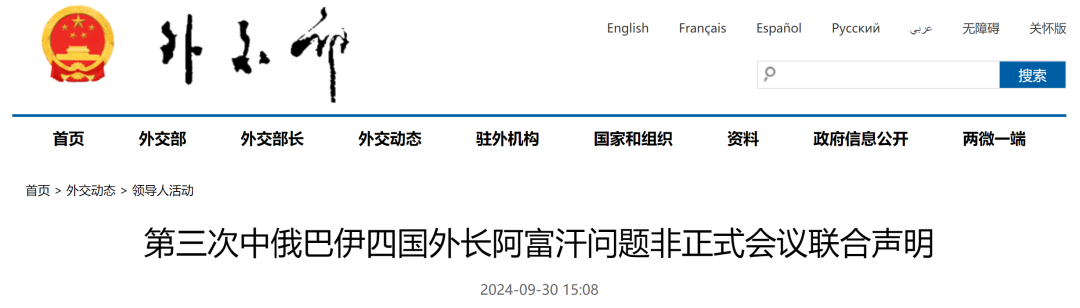 2024年9月27日,应伊朗伊斯兰共和国邀请,第三次中华人民共和国、伊朗伊斯兰共和国、巴基斯坦伊斯兰共和国和俄罗斯联邦四国阿富汗问题非正式外长会议在纽约第79届联合国大会期间举行。