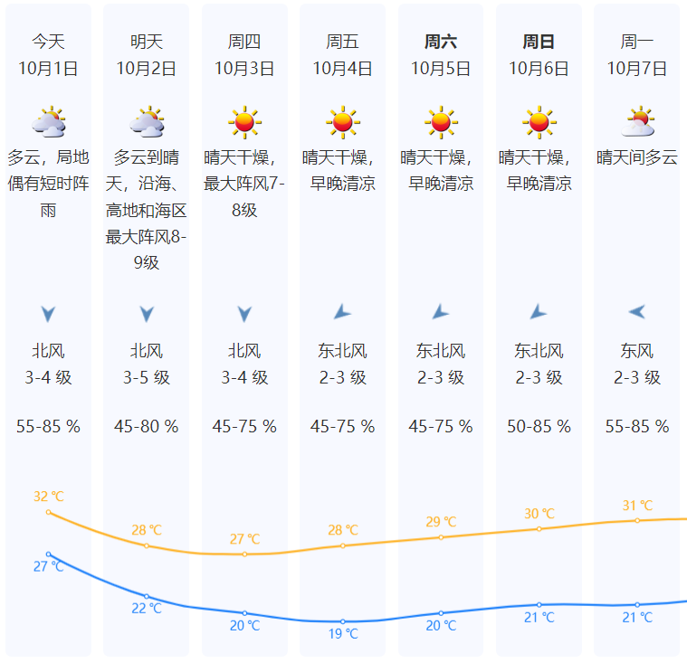 10月2-4日受冷空气影响,多云到晴天,天气干燥,气温下降,风力加大,沿海、高地和海区最大阵风8-9级。10月5-7日晴天干燥,气温小幅回升。