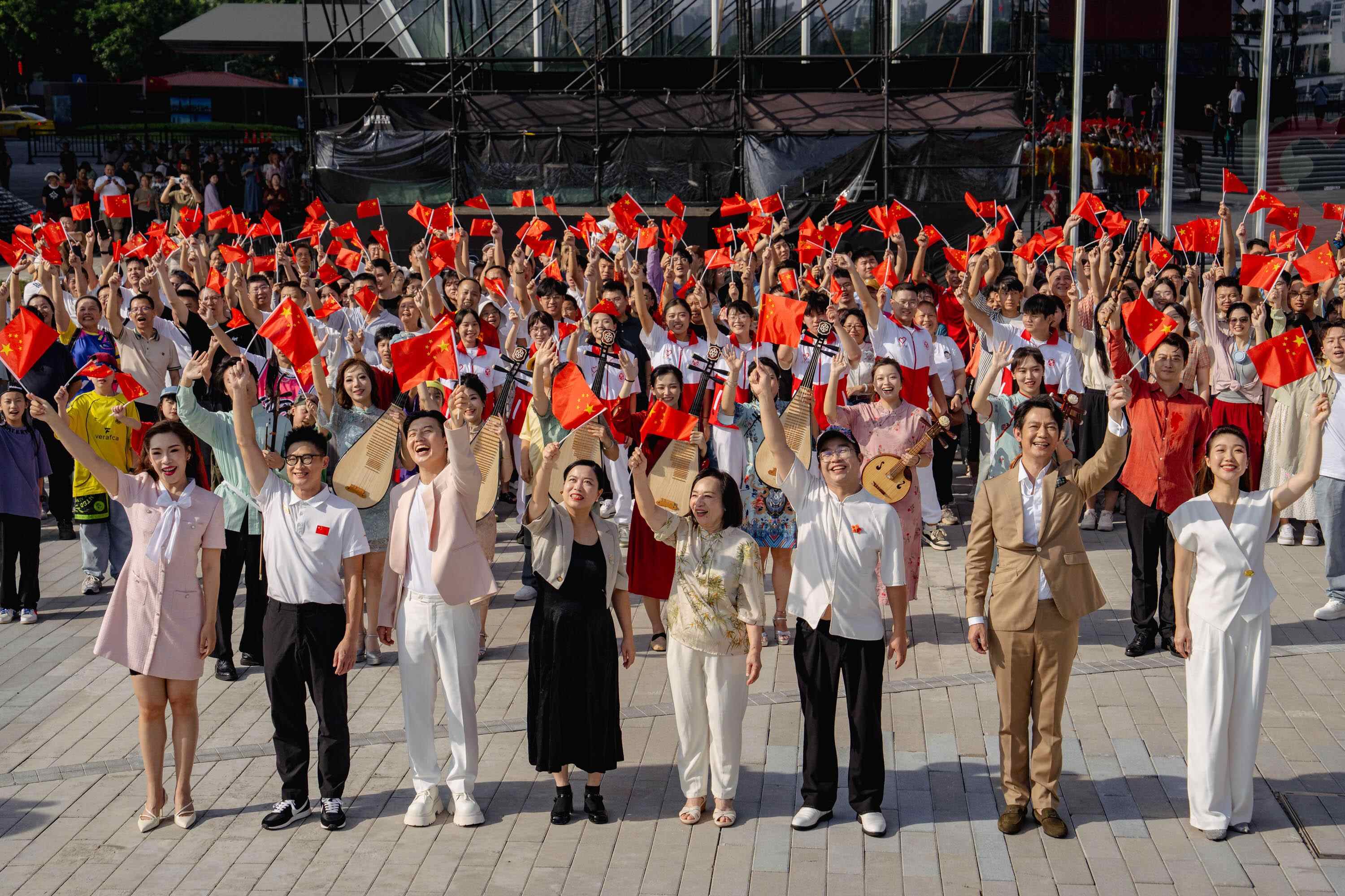 白鹅潭大湾区艺术中心江畔举行国庆“快闪”。图片来源:羊城晚报•羊城派