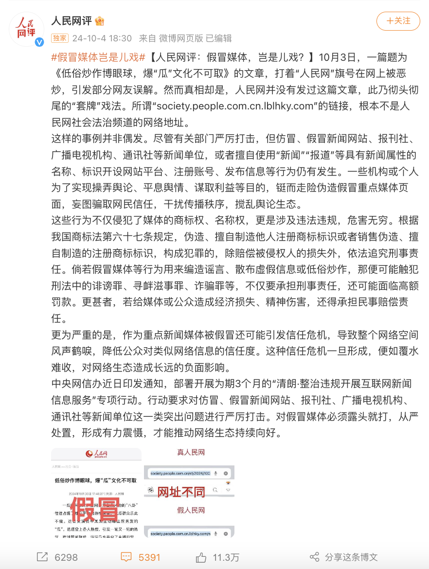 10月3日,一篇题为《低俗炒作博眼球,爆“瓜”文化不可取》的文章,打着“人民网”旗号在网上被恶炒,引发部分网友误解。然而真相却是,人民网并没有发过这篇文章,此乃彻头彻尾的“套牌”戏法。所谓“society.people.com.cn.lblhky.com”的链接,根本不是人民网社会法治频道的网络地址。