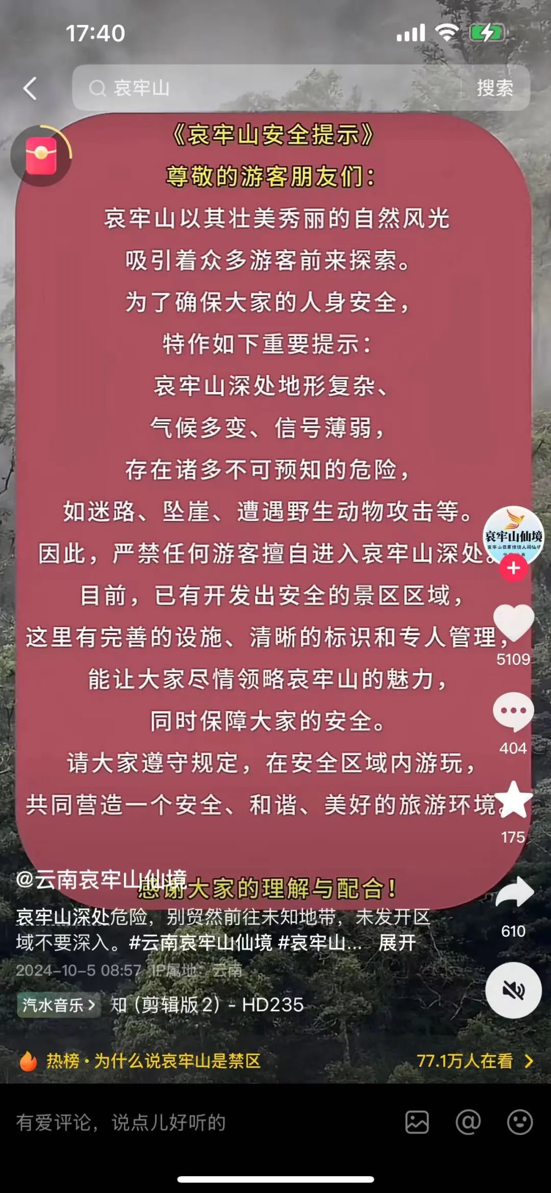 10月5日,@云南哀牢山仙境 发布安全提示:哀牢山深处危险,别贸然前往未知地带,未开发区域不要深入。