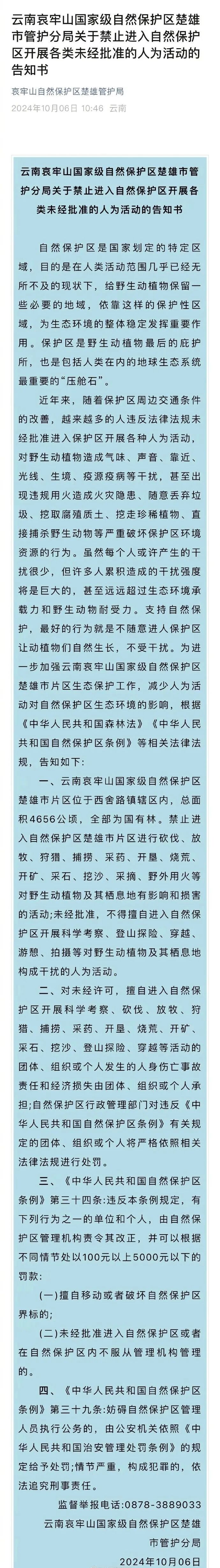 10月6日,哀牢山自然保护区楚雄管护局发布《云南哀牢山国家级自然保护区楚雄州辖区访客须知》及《关于禁止进入自然保护区开展各类未经批准的人为活动的告知书》,其中明确:未经批准进入自然保护区或者在自然保护区内不服从管理机构管理的,由自然保护区管理机构责令其改正,并可以根据不同情节处以100元以上5000元以下的罚款。