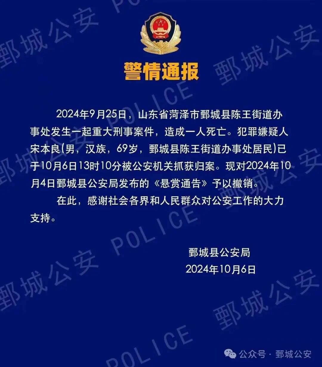 10月6日,山东省鄄城县公安局发布警情通报,一起重大刑事案件嫌疑人今日被抓获。