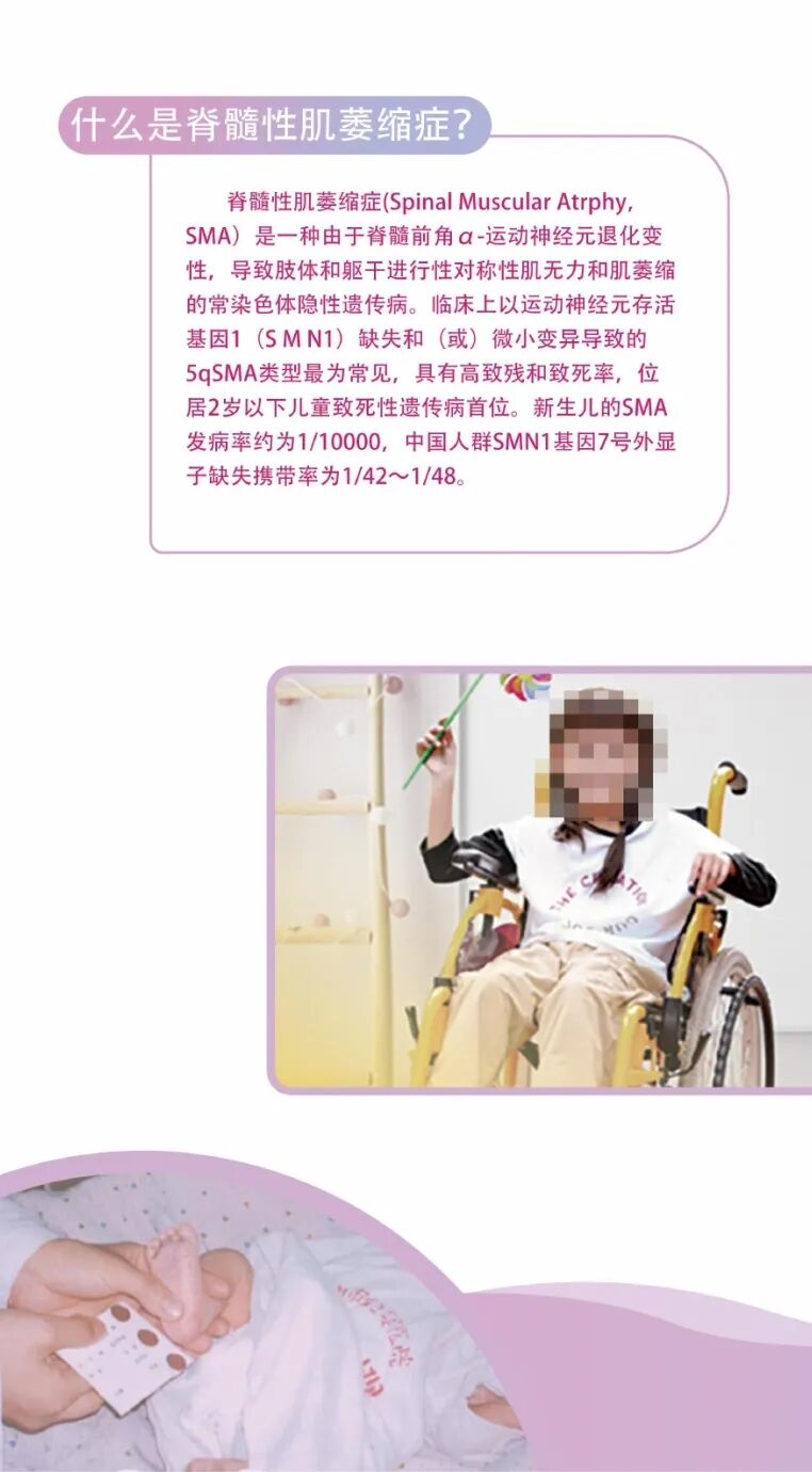 脊髓性肌萎缩症(简称SMA)是一种由于脊髓前角运动神经元退化变性,导致肢体和躯干进行性对称性肌无力和肌萎缩的常染色体隐性遗传病,位居2岁以下儿童致死性遗传病首位。