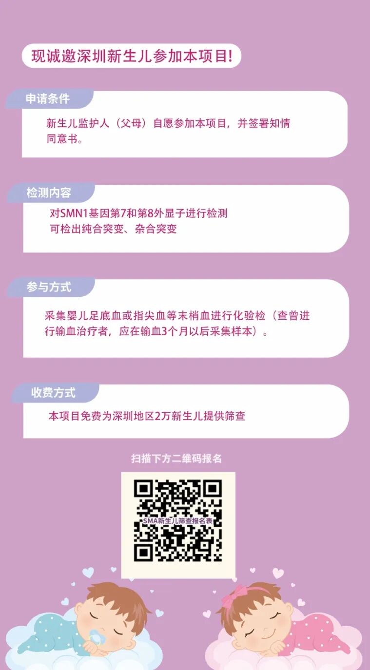 本临床研究项目为深圳6个月以下的婴儿免费筛查检测SMA基因,有需要的家属请扫描上方二维码报名采血,报名成功后在工作日来新生儿疾病筛查中心实验室采血。检验报告及阳性婴儿的随访诊疗方式在采血时告知家属。