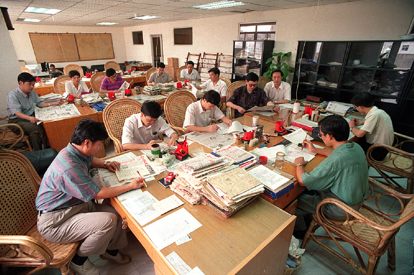 1993年深圳特区报总编室的编辑在新装修好的办公室精心编辑。