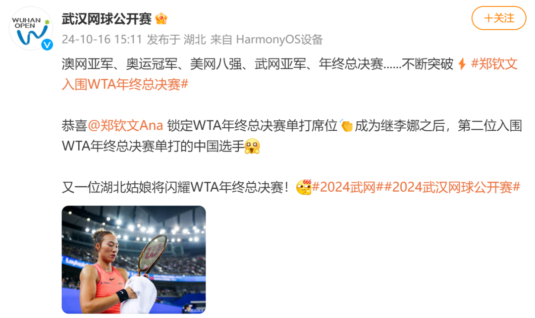 16日下午,@武汉网球公开赛 发文庆祝郑钦文锁定单打席位。