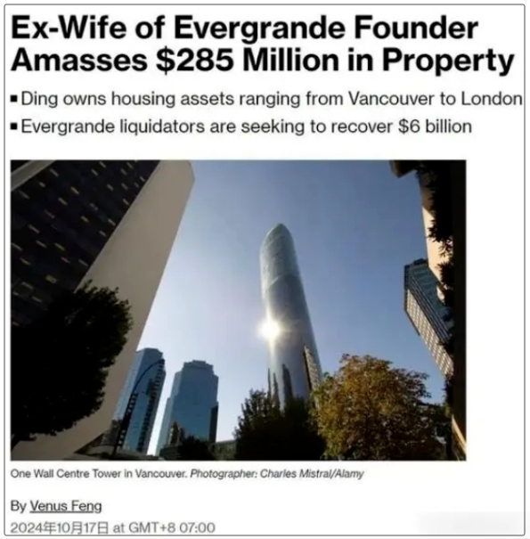 据彭博社17日报道,根据法庭文件和彭博新闻的调查,丁玉梅在全球拥有价值高达2.85亿美元的房产,包括位于温哥华的公寓和伦敦的豪宅。