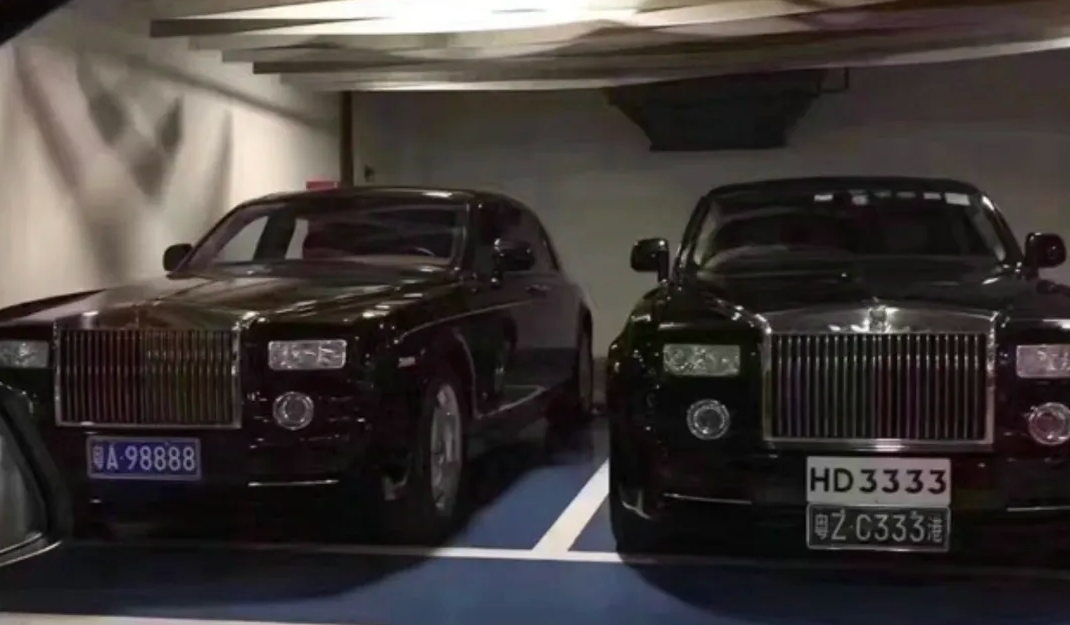 两辆劳斯莱斯幻影轿车,其中一辆车牌为3333,是中国恒大集团的股票代码,该车价值在900万元左右↓